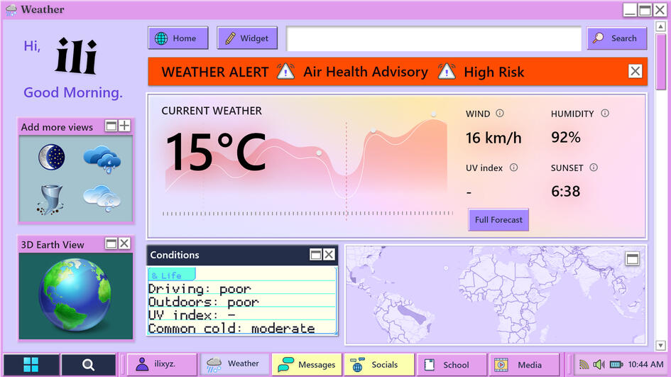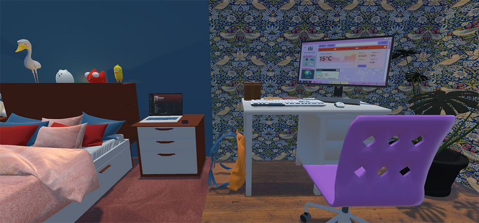 Piece-ful Mind (2022) is a storytelling exploration of isolation, the ways in which we seek community, and our tangled existence with technology. Inspired by nostalgia, the use of early web 2.0 and 90’s aesthetics acts as a juxtaposition to our relationship with predictive algorithmic, content-driven information that continuously saturates our lives.Through the different artifacts, we follow a teenage character and her interactions with different worlds; the physical world (her bedroom), the digital world (screens), and her internal world, in the form of a visualized internet "rabbit hole". The final piece intends to convey a slice of her life that reflects a blurring of digital and physical realities. This project was created using a combination of Unity 3D, computer graphic art, and AI generated imagery using prompt engineering.